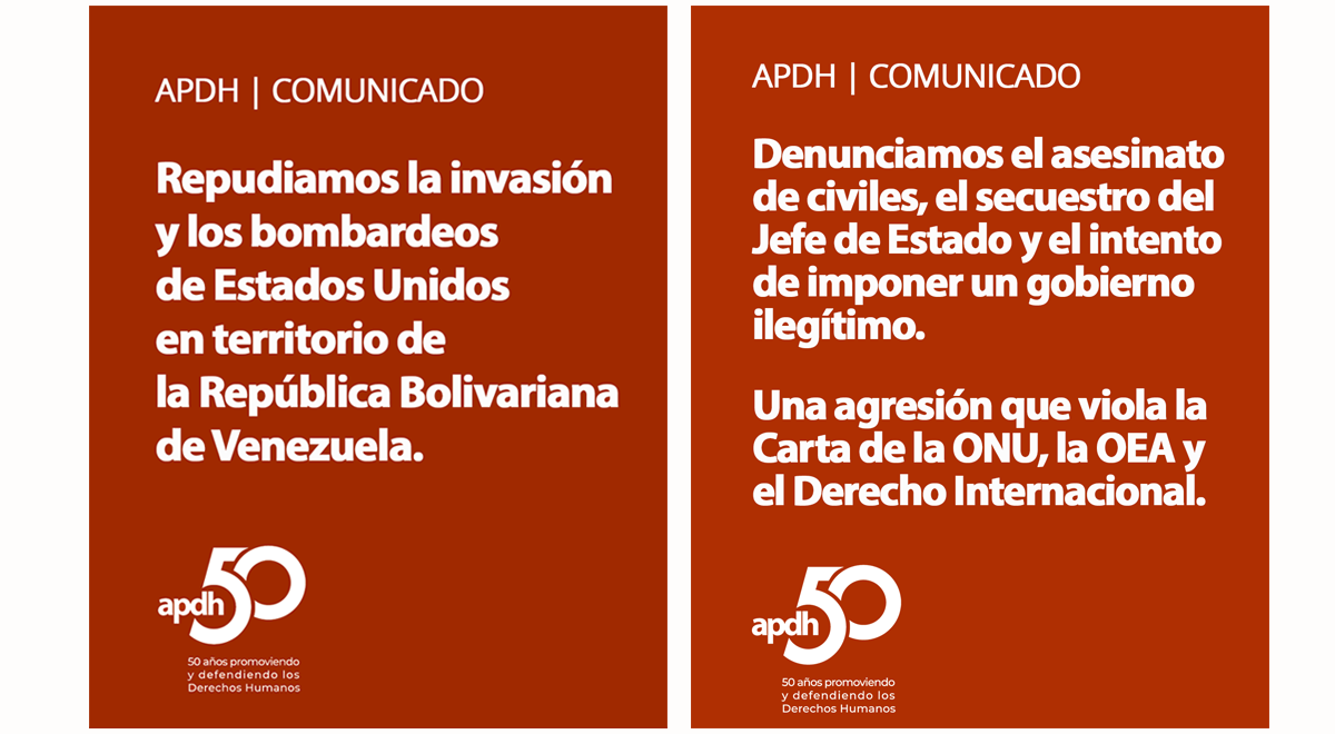 Ante los hechos ocurridos en la República Bolivariana de Venezuela, la Asamblea Permanente por los Derechos Humanos expresa su más enérgico repudio a la intervención militar de los Estados Unidos, a los bombardeos realizados, a las muertes provocadas, al secuestro del Jefe de Estado y su esposa, y al intento de imponer un gobierno subordinado a intereses externos.
