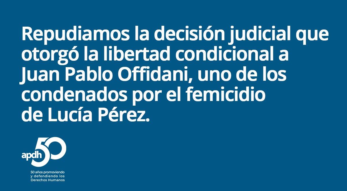 APDH repudia la decisión del Tribunal Oral en lo Criminal N°2 que le concedió la libertad condicional a Juan Pablo Offidani, uno de los condenados por el femicidio de Lucía Pérez