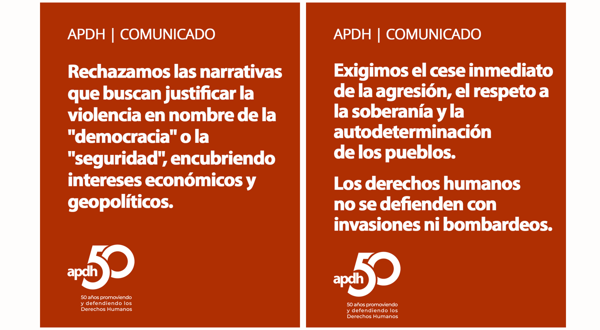 Ante los hechos ocurridos en la República Bolivariana de Venezuela, la Asamblea Permanente por los Derechos Humanos expresa su más enérgico repudio a la intervención militar de los Estados Unidos, a los bombardeos realizados, a las muertes provocadas, al secuestro del Jefe de Estado y su esposa, y al intento de imponer un gobierno subordinado a intereses externos.